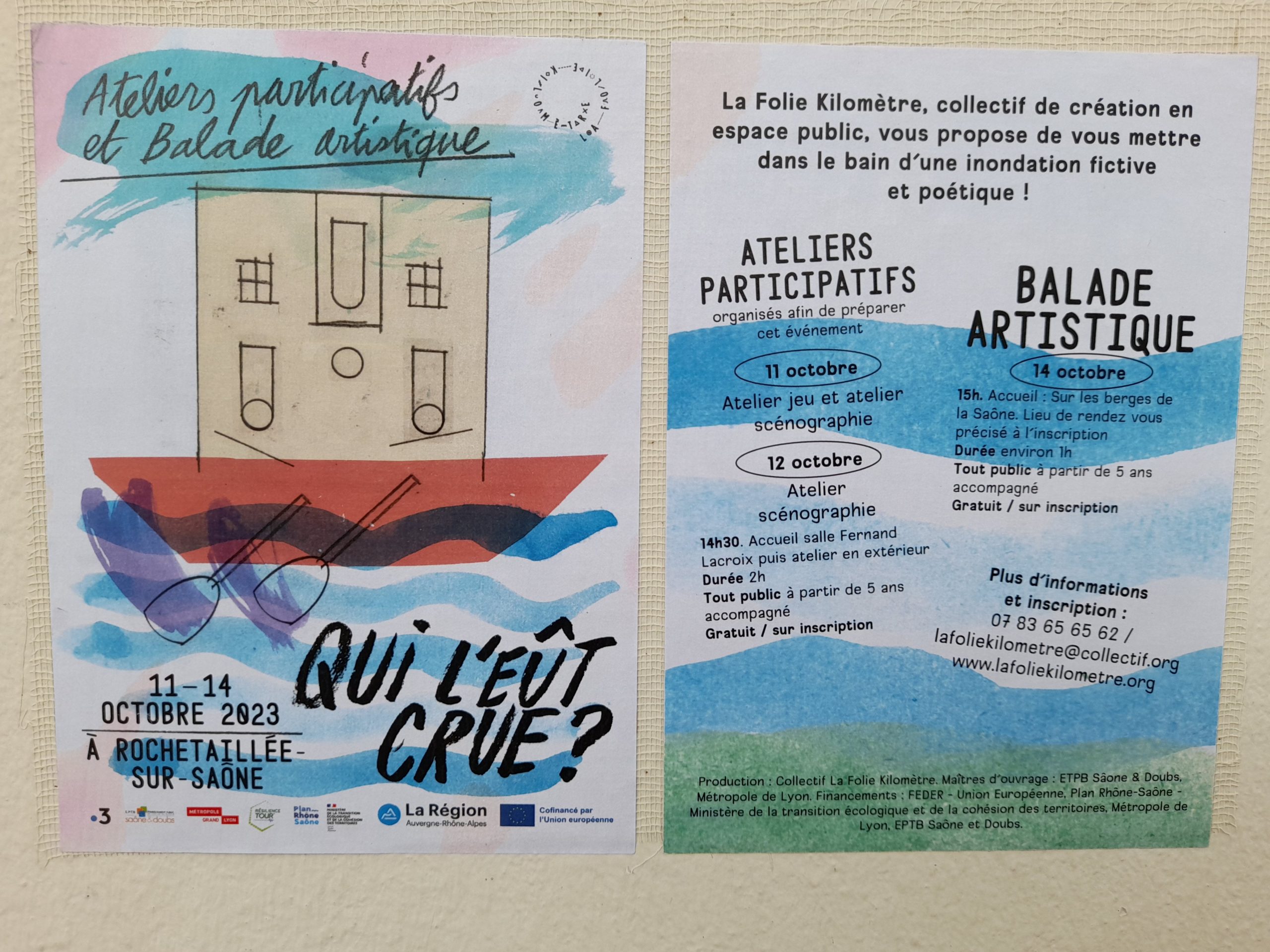 Description de l’action : Médiation artistique autour du risque inondation sur l’axe Saône Balade animée par des comédiens aux abords de lieux emblématiques du risque inondation, qui questionne la place de l’eau dans le paysage du Val de Saône. Parcours qui met dans la peau d’une inondation fictive et poétique, grâce à des installations plastiques, collages, tableaux habités et de mots paysages. Des ateliers participatifs sont organisés avec les scolaires en amont pour préparer l’événement grand public.