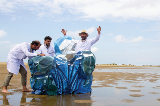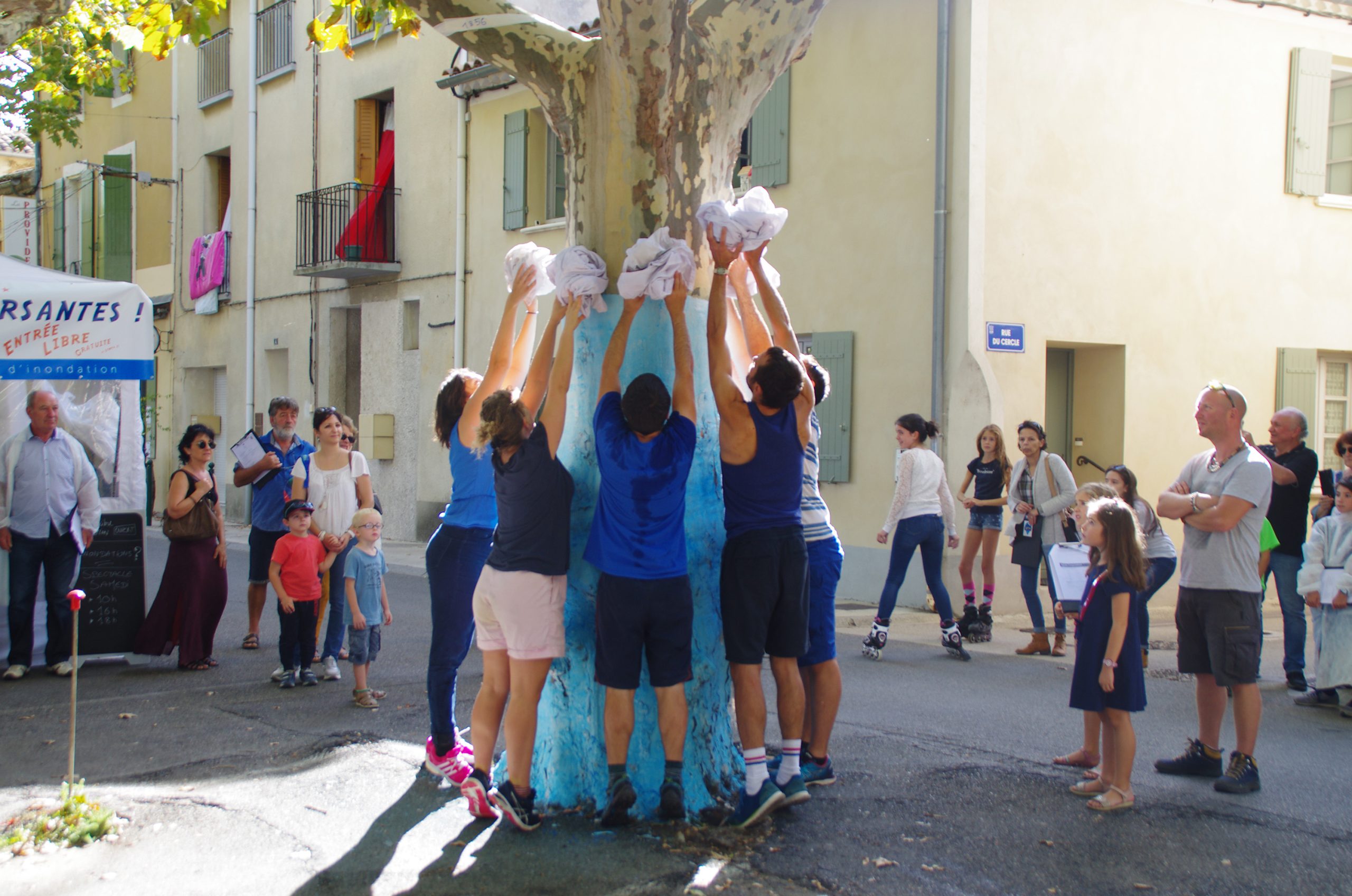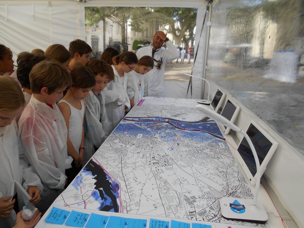 Description de l’action : Exposition itinérante qui conte une histoire du fleuve, de son fonctionnement et de ses inondations, à travers une grande mythologie. Derrière l’aspect ludique et poétique se cache un discours plus scientifique expliquant les multiples causes des inondations à travers le sujet du bassin versant (de l’embouchure jusqu’à la source du Rhône). Cette exposition est composée d’animations interactives (personnages, peinture d’arbres en bleu au niveau de la crue de référence, promenade pour comprendre le système fleuve, jeux..) ainsi que d’une performance artistique sur le thème des inondations. L’expédition a conduit à la création carnet web.